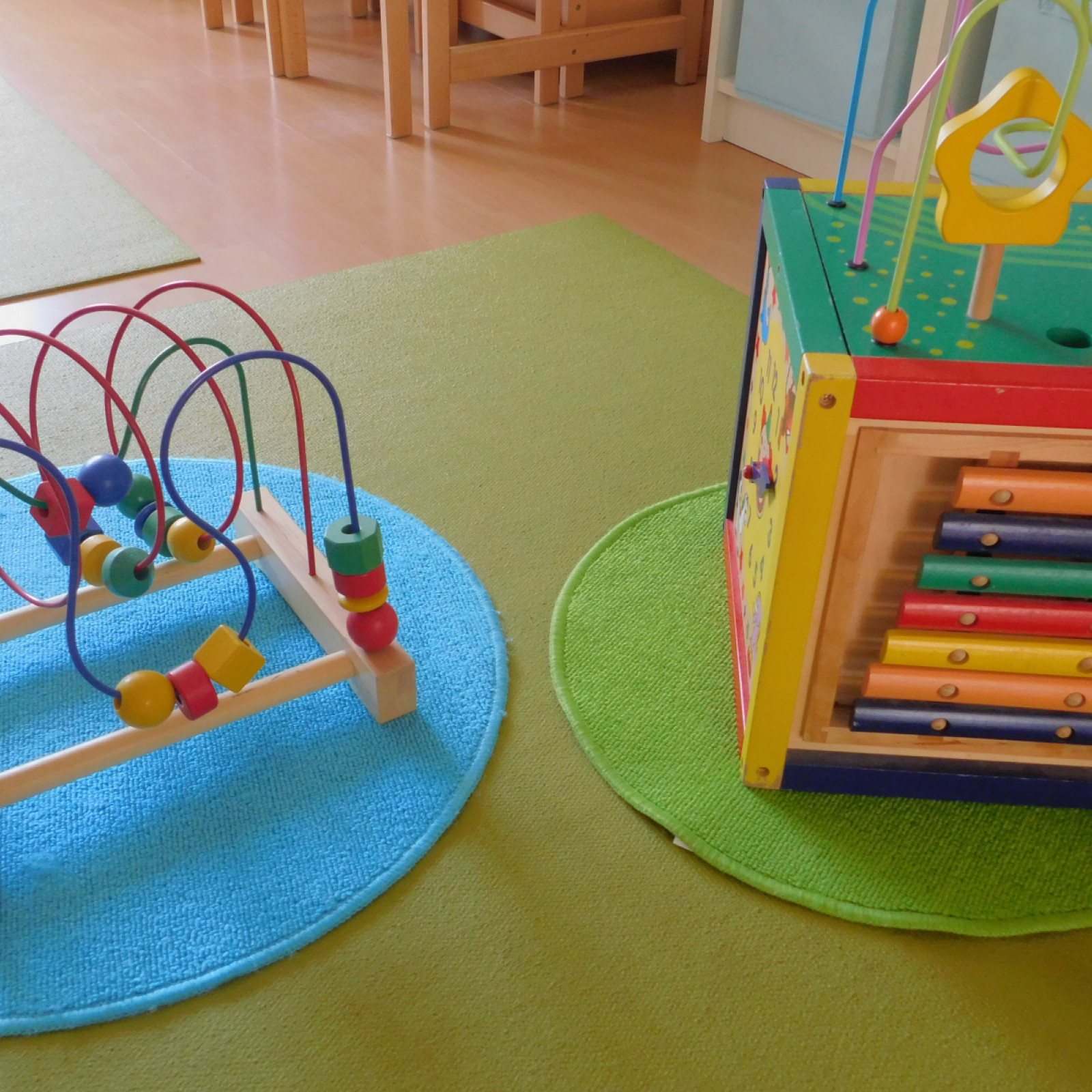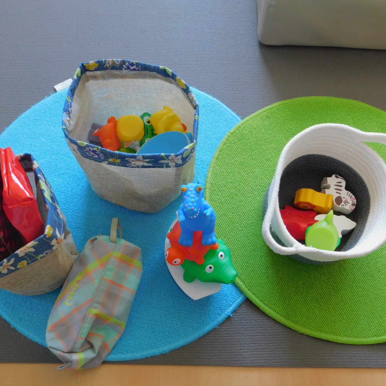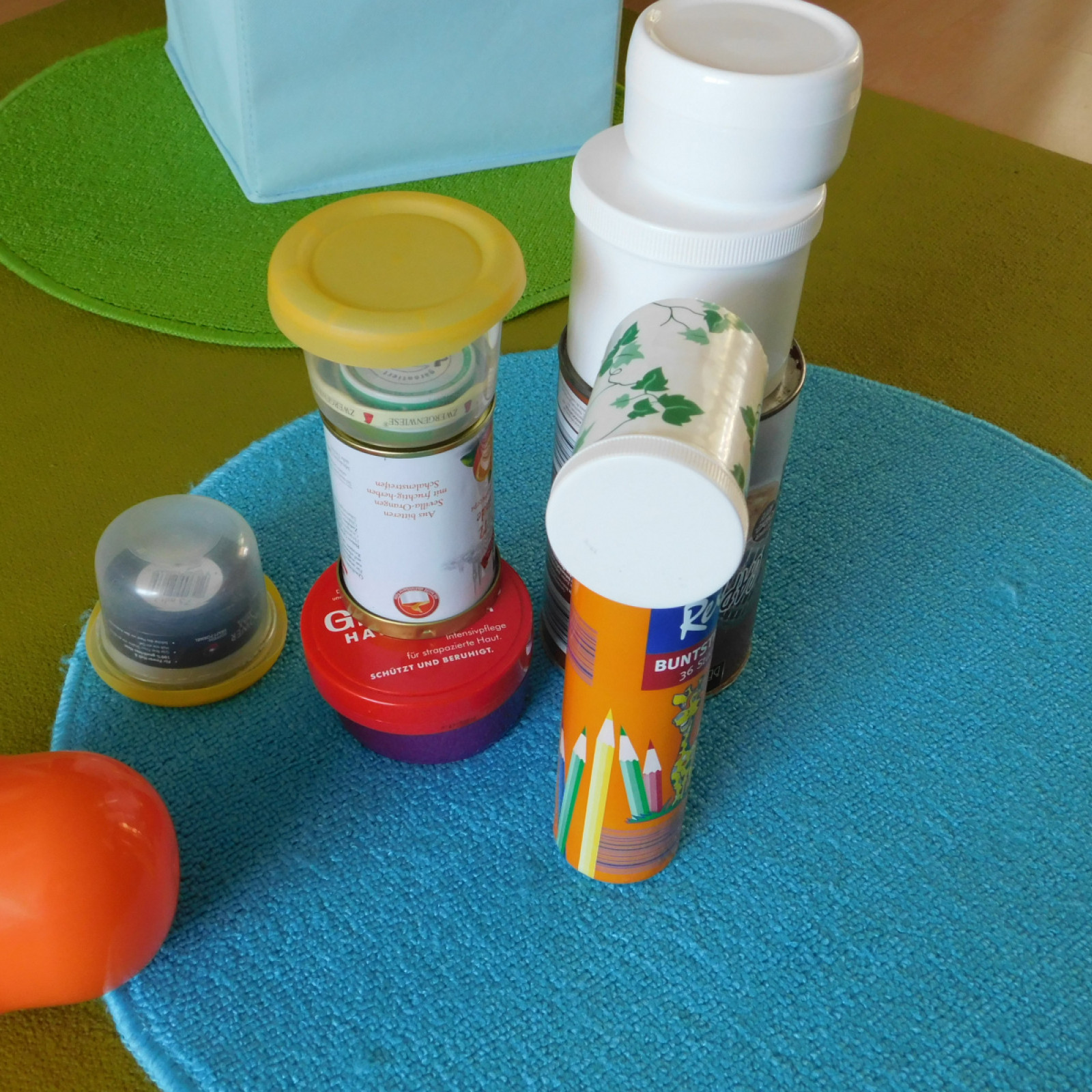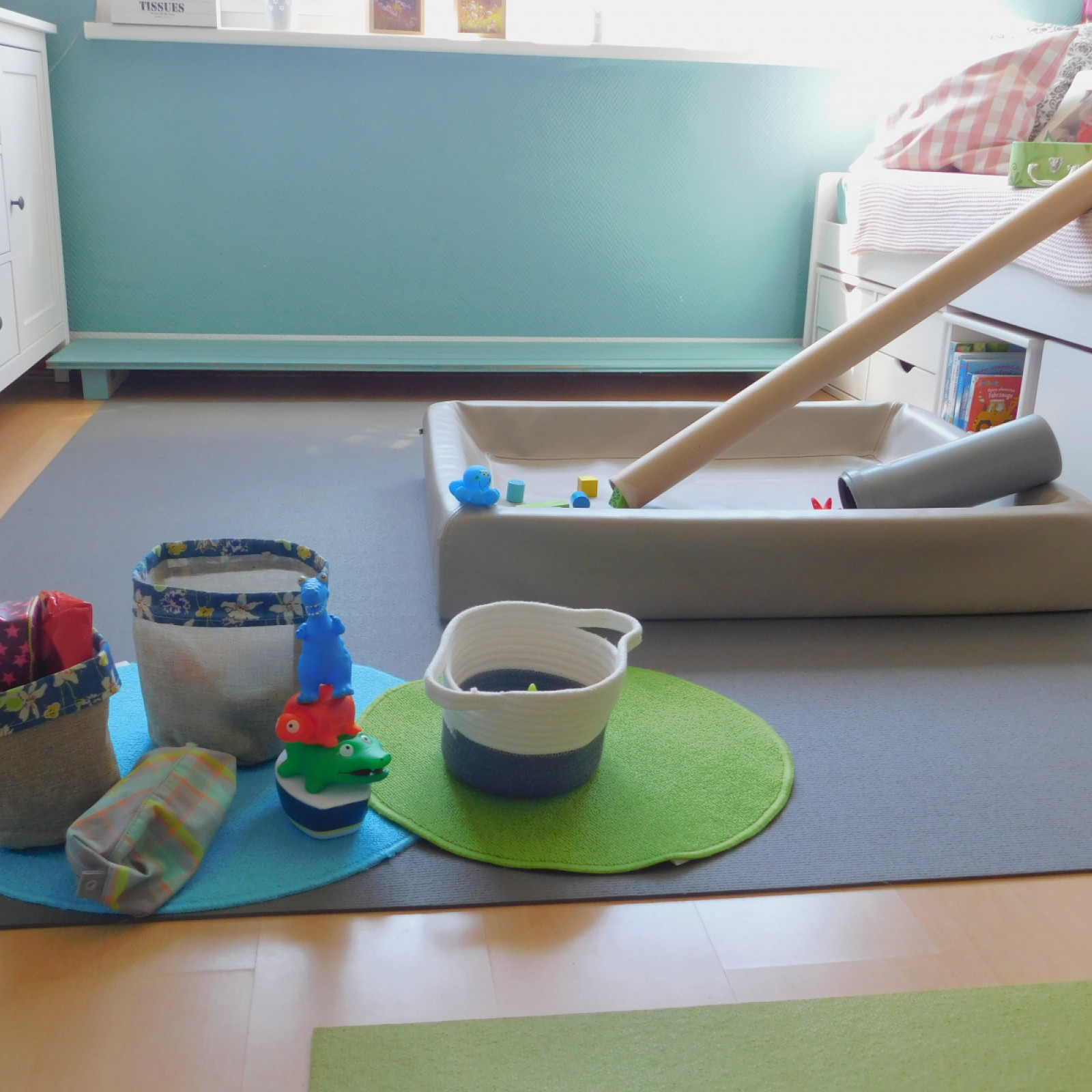Der Spielbereich wird individuell auf die Bedürfnisse der Kinder vorbereitet. Die Bedürfnisse entnehme ich den aktuellen Entwicklungsthemen der Kinder. Entwicklungsthemen sind beispielsweise: stapeln, stecken, werfen, bewegen, schütten u.v.m. Auf den Bildern ist nur ein Bruchteil möglicher Angebote zu sehen. Noch mehr Beispiele finden Sie hier: