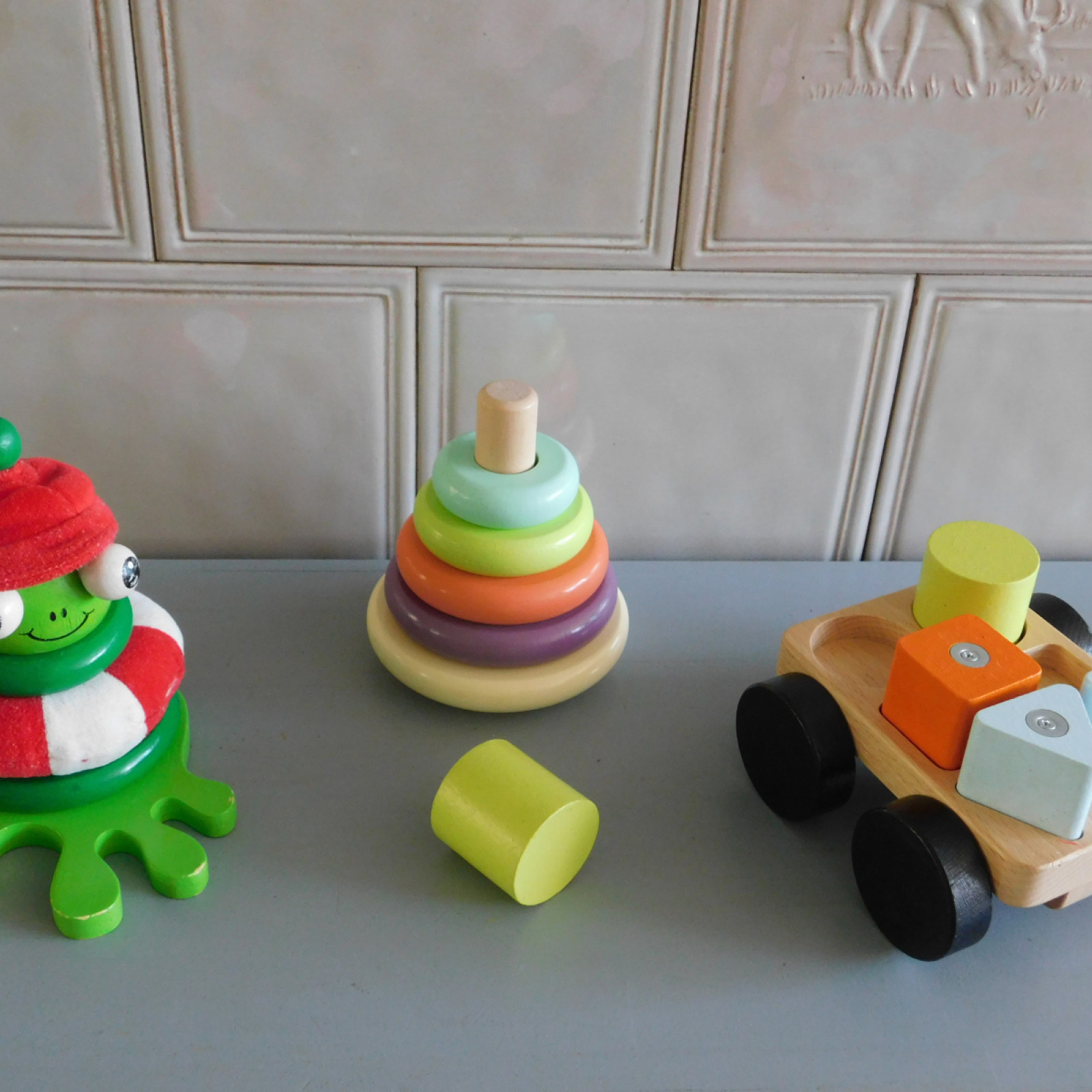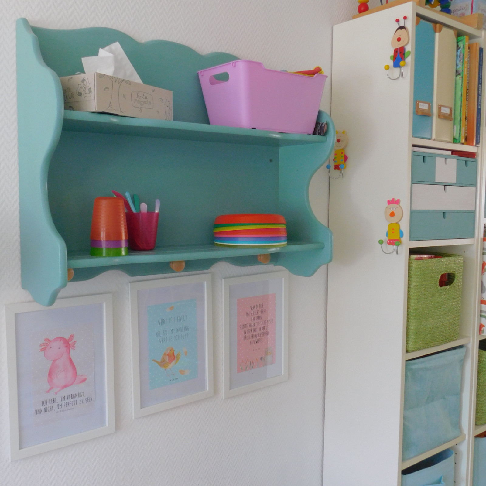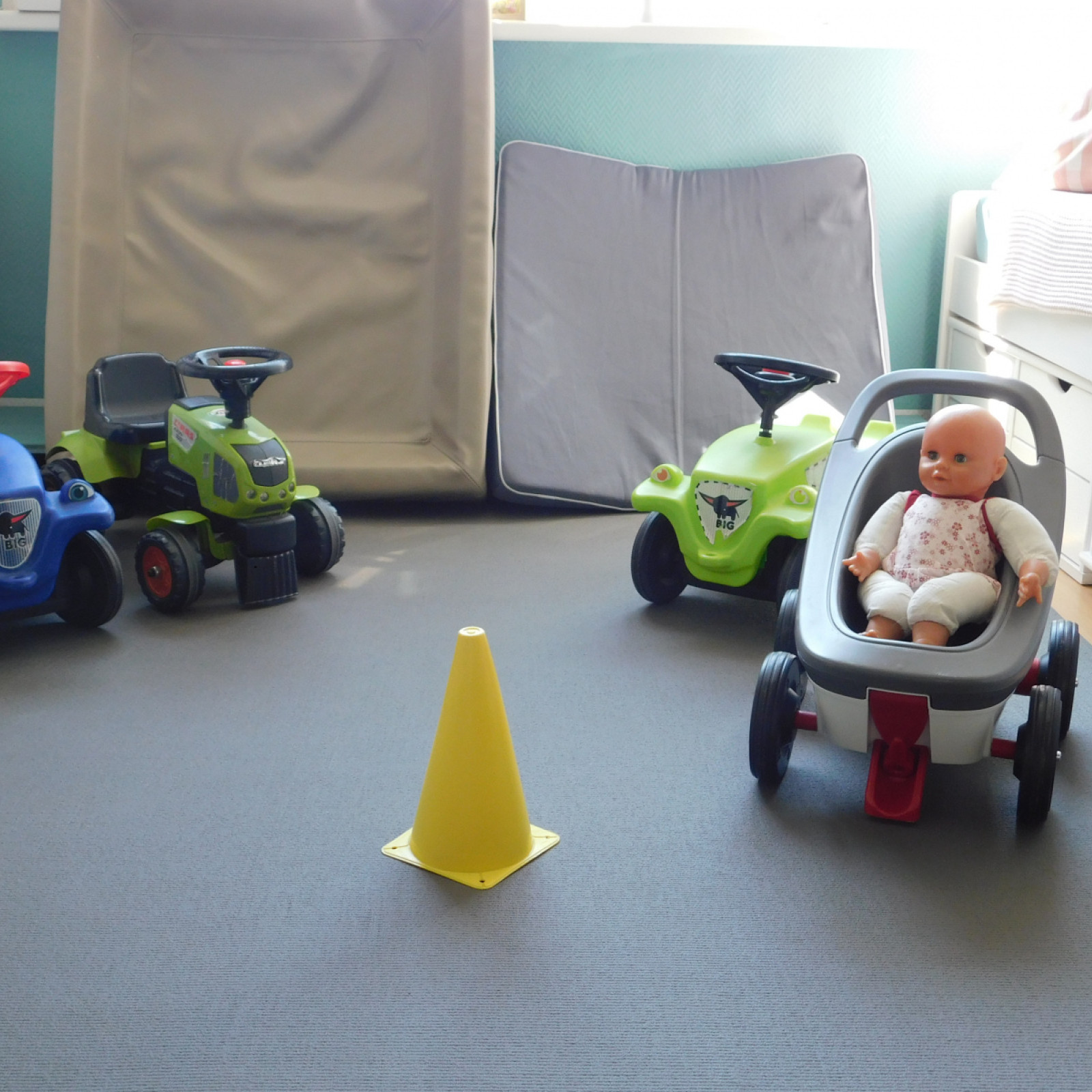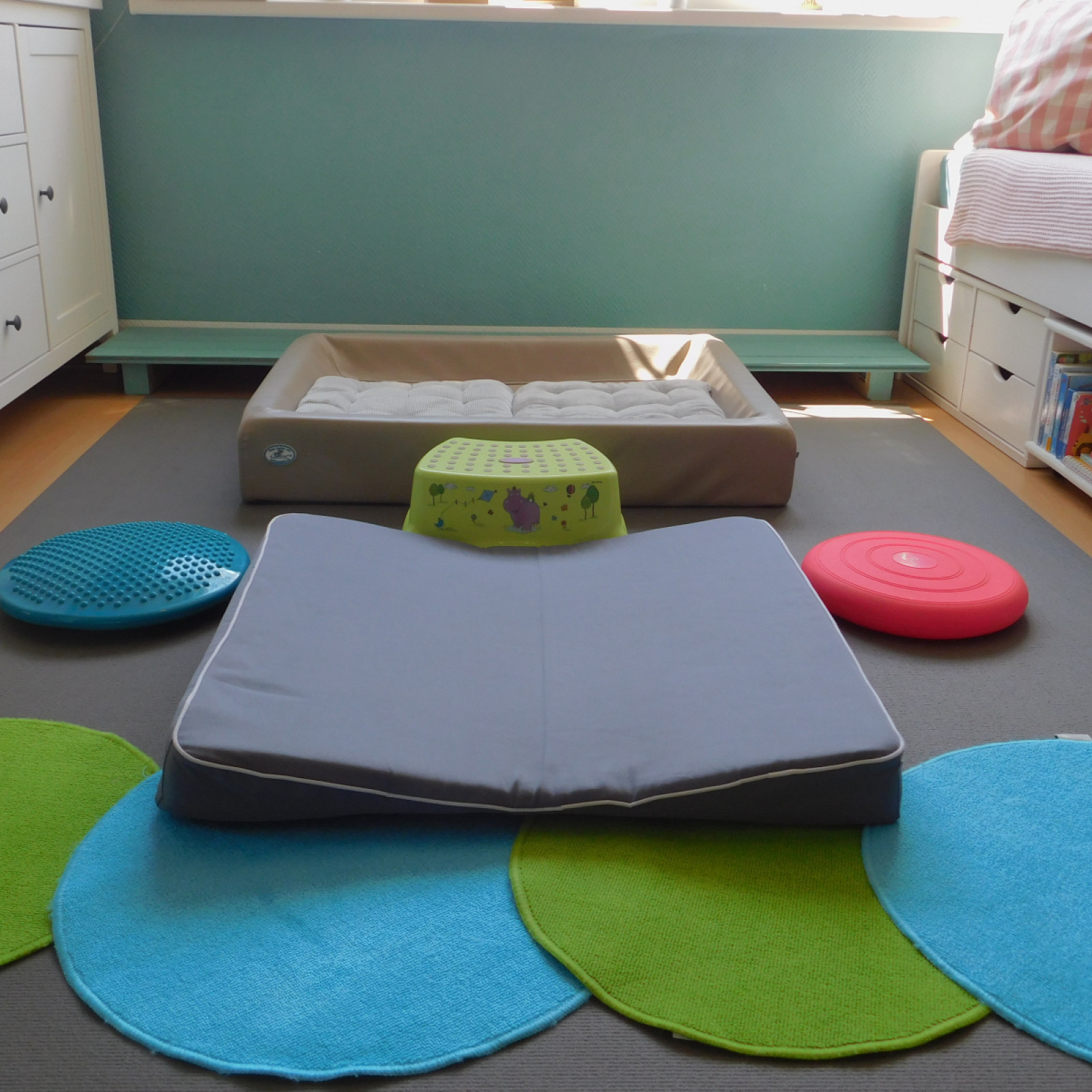 Der Spielbereich wird individuell auf die Bedürfnisse der Kinder vorbereitet. Die Bedürfnisse entnehme ich den aktuellen Entwicklungsthemen der Kinder. Entwicklungsthemen sind beispielsweise: stapeln, stecken, werfen, bewegen, schütten u.v.m. Auf den Bildern ist nur ein Bruchteil möglicher Angebote zu sehen. Noch mehr Beispiele finden Sie hier: