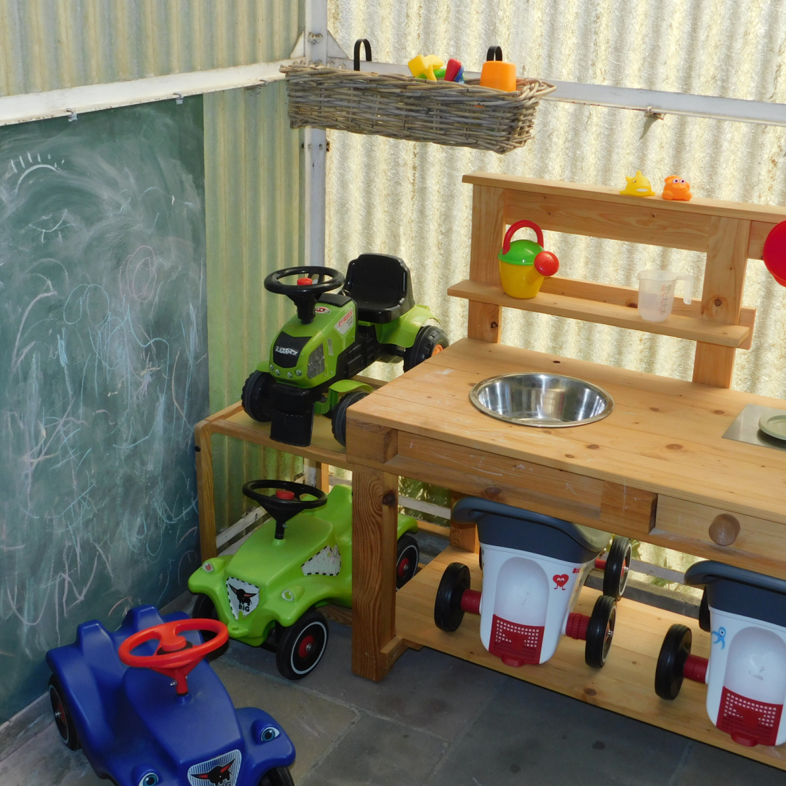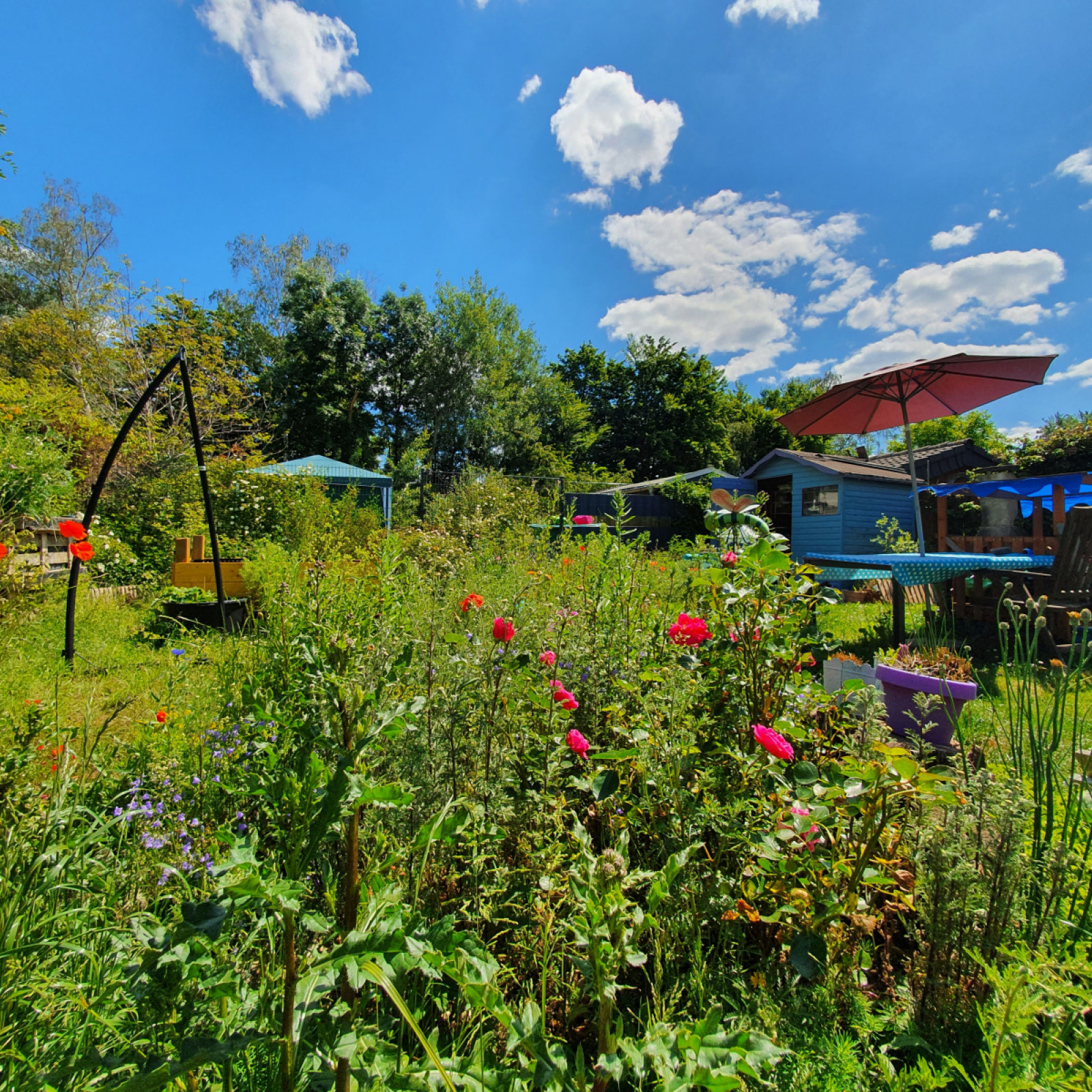 Der Spielbereich wird umgeben von einem Naturnah gestalteten Garten, der spannende Beobachtungen ermöglicht. Ein Pavillon spendet in den Sommermonaten Schatten.
